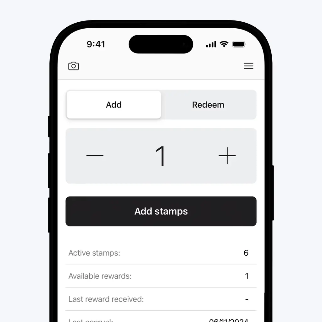Scan clients' digital loyalty pass from any phone, tablet, or connected barcode scanner. Issue stamps, award points, or redeem rewards in seconds.